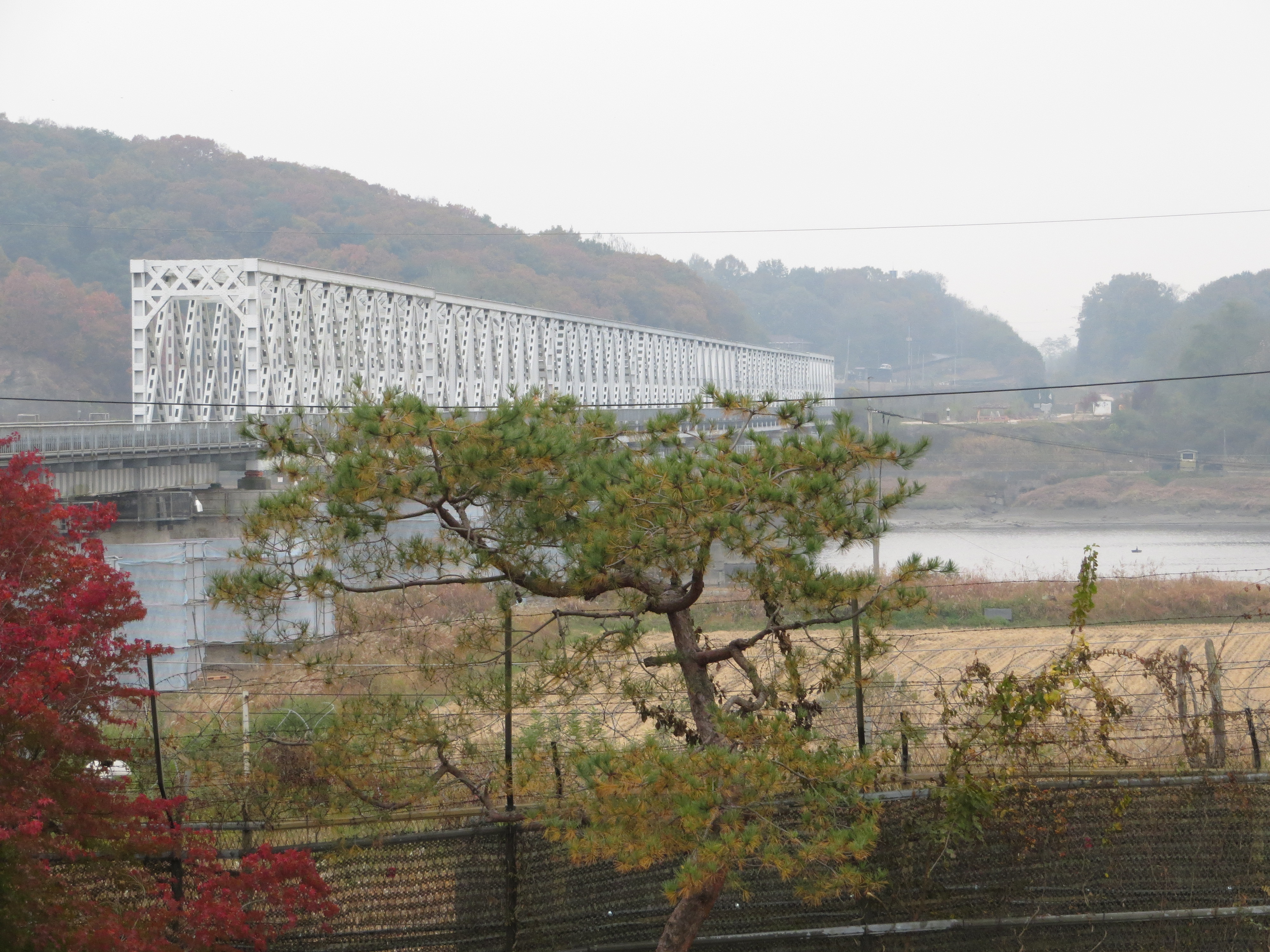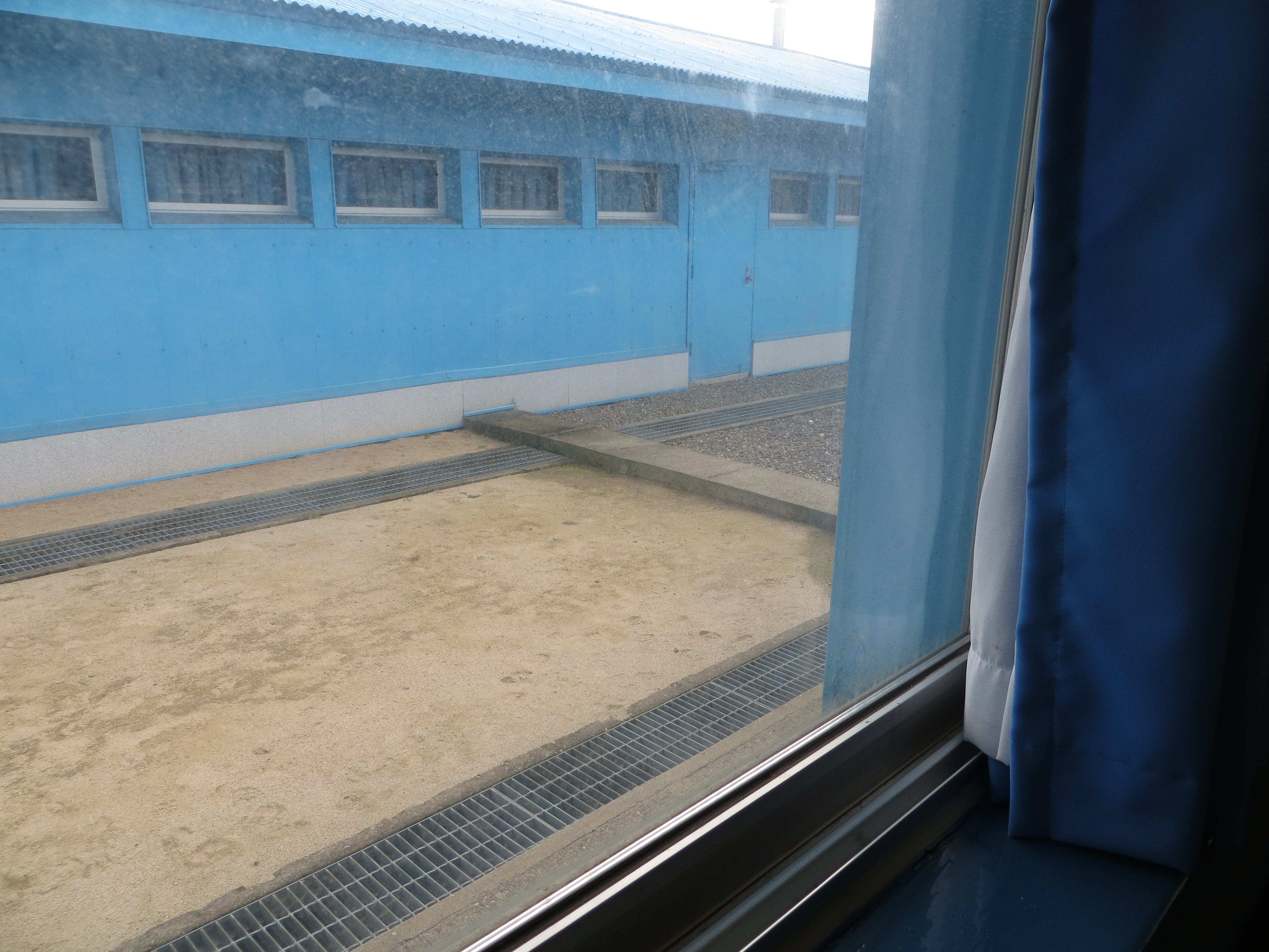 This is a picture I took in North Korea, looking back into South Korea. I think you can make out the borderline, that cement slab. We’re literally in North Korea looking into South Korea.