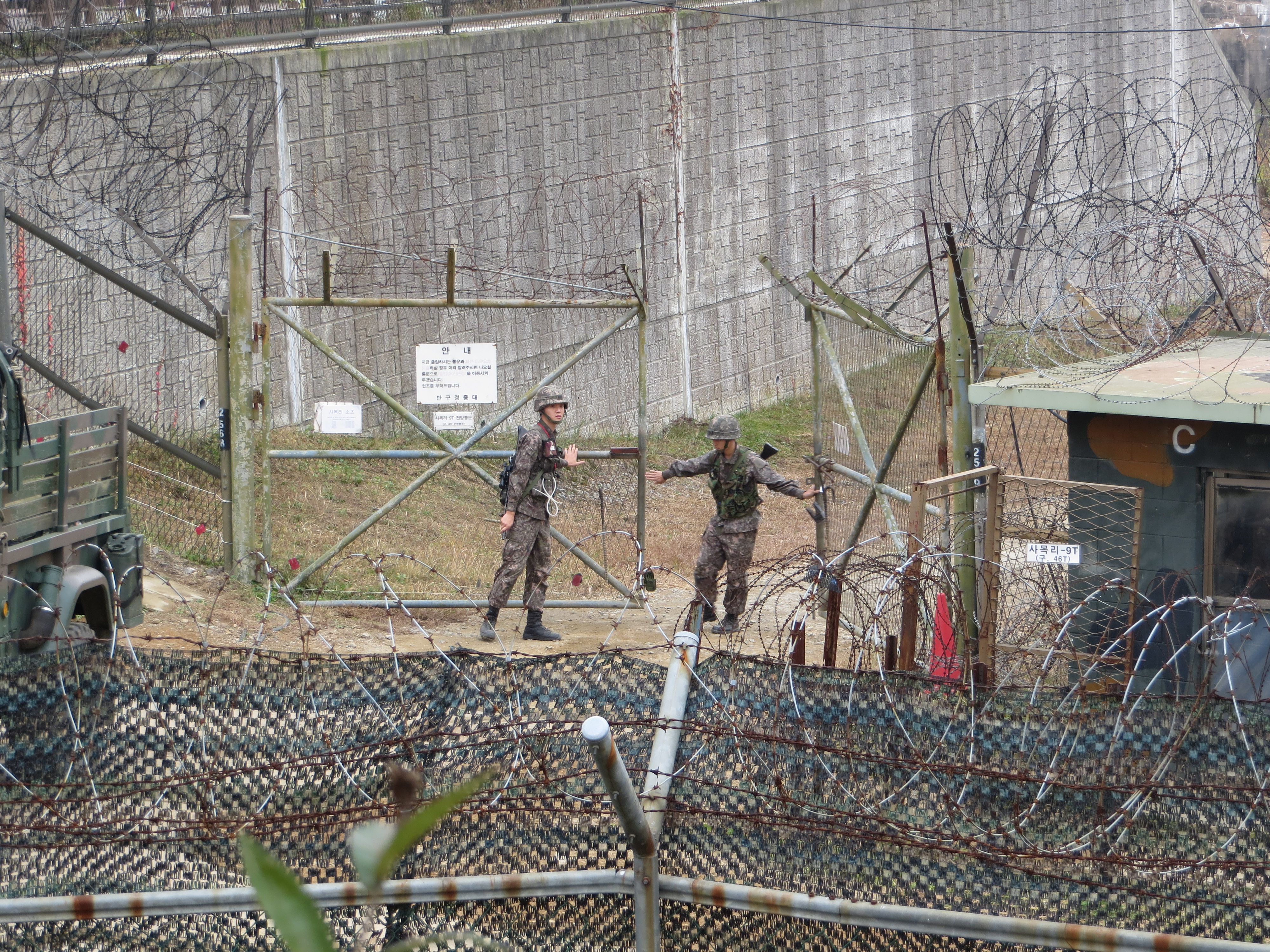 And then, of course, a reminder of the present-day reality as a platoon of South Korean soldiers moseyed up next the park, out on patrol, and likely posturing for the other side.