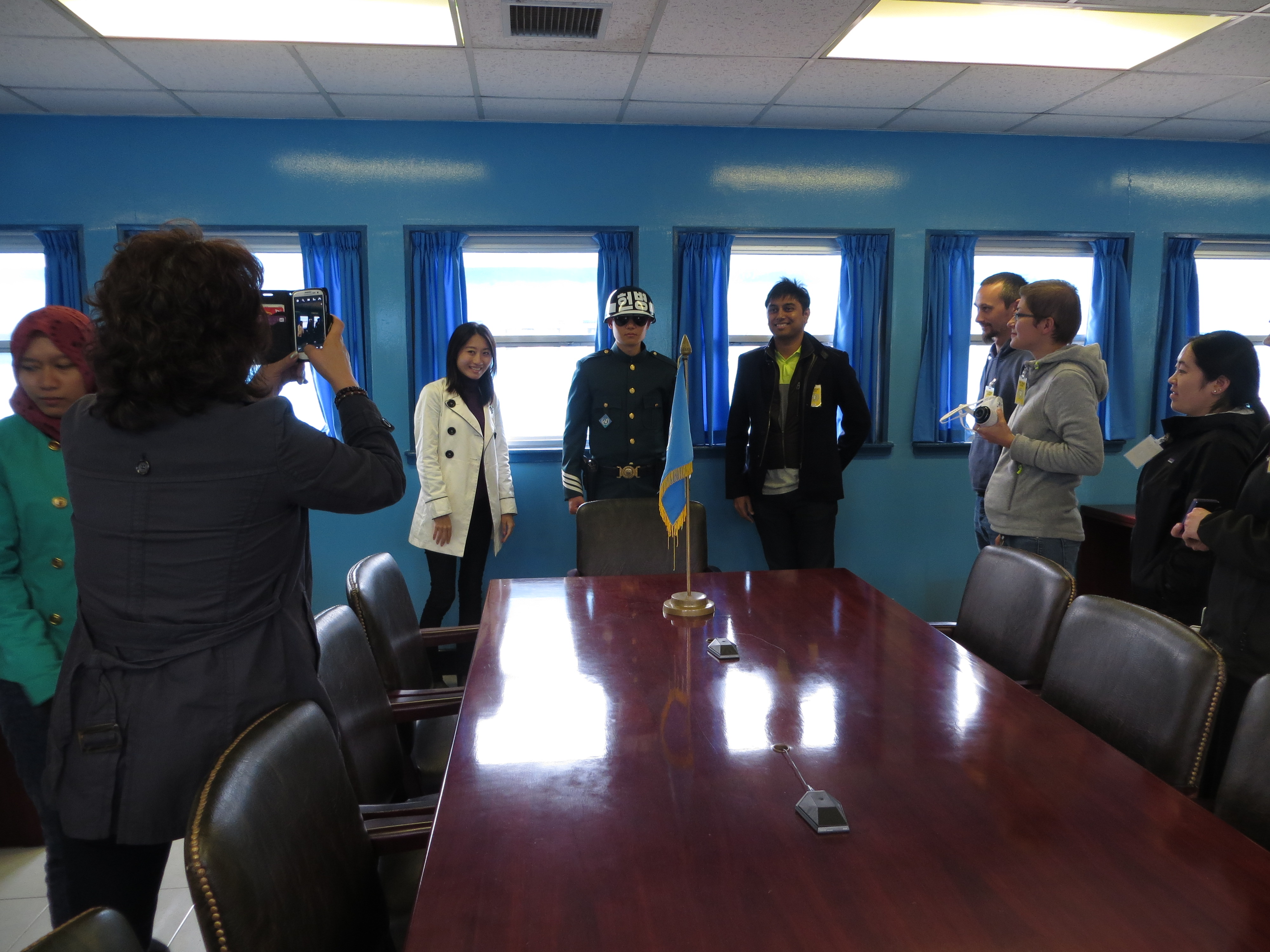 We were led into the main conference room building, which spans North and South. Both sides are allowed in this building, and hold talks at a table that sits right on the border. It’s the only place on the peninsula where the North can go into the South, and the South can go into the North. Private Martinez told us what I just told you. And then he gave us the thumbs-up on photos – it’s not like the North Koreans don’t know what it looks like.