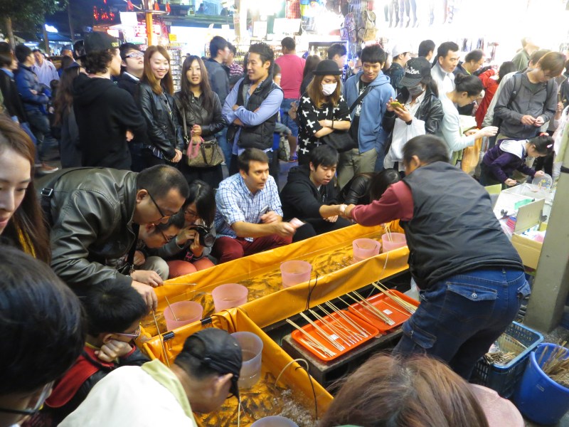 John fishing for his dinner at a night market. You catch your own shrimp and they grill them up for you!