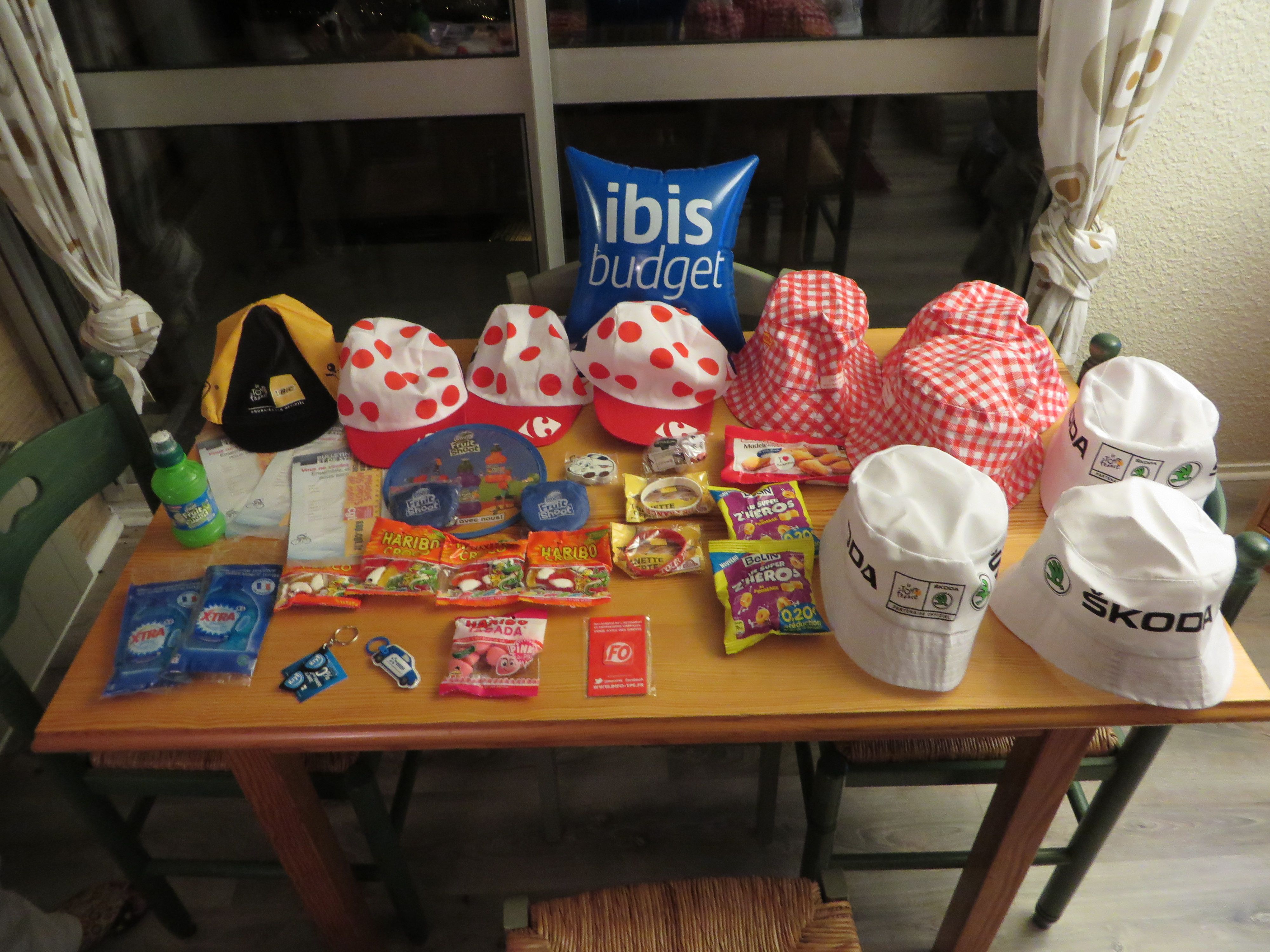 When the Caravan came by, though, we nearly forgot about the polka-dot hat. There were FREE THINGS flying through the air! We got TWO PACKAGES OF DETERGENT!! Then there were the bags of Haribo gummy candies. Amy scrambled and caught a collapsible Frisbee thing. We started fighting kids to get stuff. One car came flying by and about a dozen bags of some horrible cheese doodles came flying at us. We got about ten of them. One car tossed out a bunch of white Skoda bucket hats, and Rick, with his extensive reach, basically grabbed a bunch out of the guy’s hand. I dove under a car to grab a keychain, tearing up my knee on the gravel. Beth caught some kind of disgusting soft drink sample. We fought for wristbands, flexible rulers, erasers, and an inflatable plastic pillow. And yes, we got Rick’s polka-dotted hat – three of them, in fact. I turned to Beth at one point and yelled, “I’ve never been more excited to get all this cheap crap I’m going to throw out tomorrow!” It was an orgy of avarice, and we were worked into a state of Gallic commercial ecstasy.