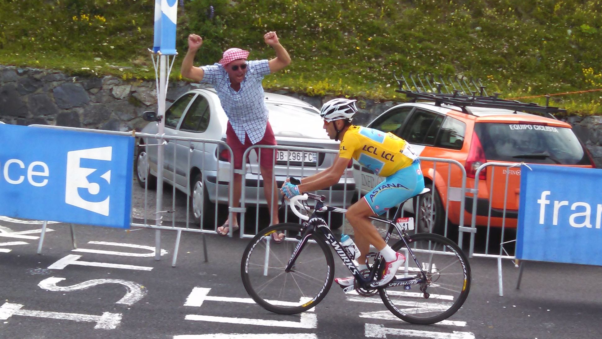 Then the murmur of the crowd rose to cheers, as the lead rider approached. A few police motorcycles and official cars came flying by, and then – ZOOM – with great pace and remarkable uphill speed, the lead rider, Rafal Majka, a hill-climber, raced by TAKING THE TURN WIDE, with the TV camera passing me looking the other way. My TV chance was blown. Amy, however, in her blue hat, and Beth, fully dressed in yellow, may have made it on TV, if you can pick them out of this freeze frame as Majka flew by.