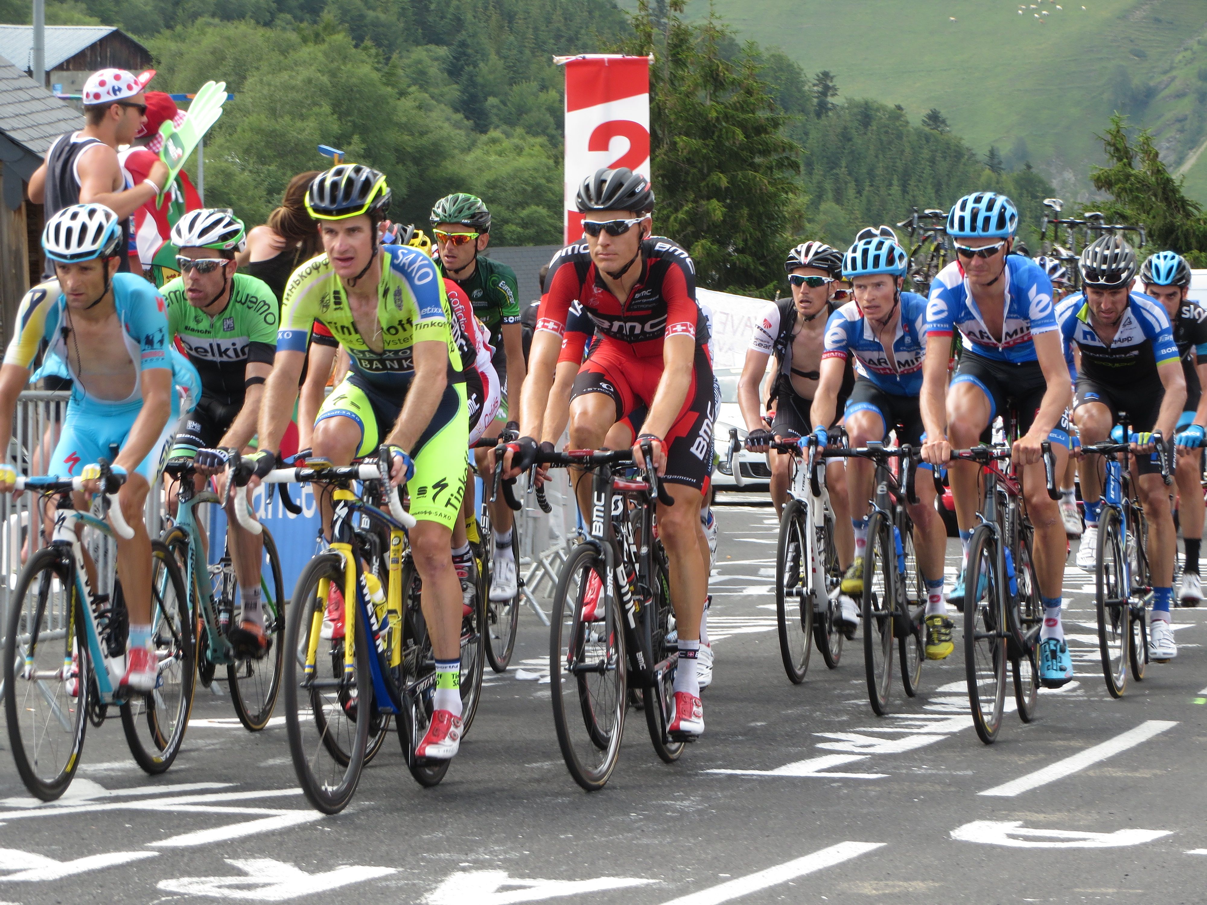 With the brief high of consumption now behind us, we were ready for the riders themselves make their way in our direction. The condo’s TV let us know they were somewhere on the other side of the ridge across the valley, and soon we started to see helicopters in the distance as the riders got closer to the pass. People with binoculars and good cameras signaled that the leaders and the rest of the peloton were crossing over into the valley, and with a squinting look you could see the team cars and tour officials coming down the valley roads towards the village. At speeds of 30-40 miles an hour, the lead riders would be below us in St. Lary in no time, and up to us in Pla d’Adet in a half-hour or so.