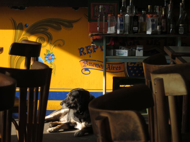 Dog in prime location: sunny spot in a steak house