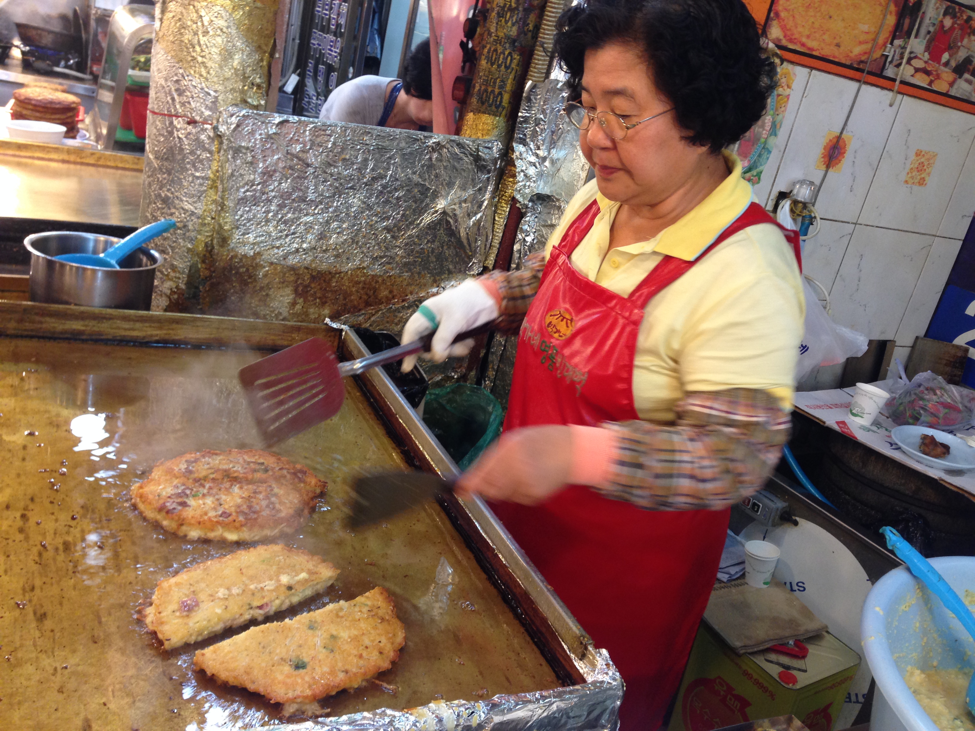 Korean pancakes being made at the night market.